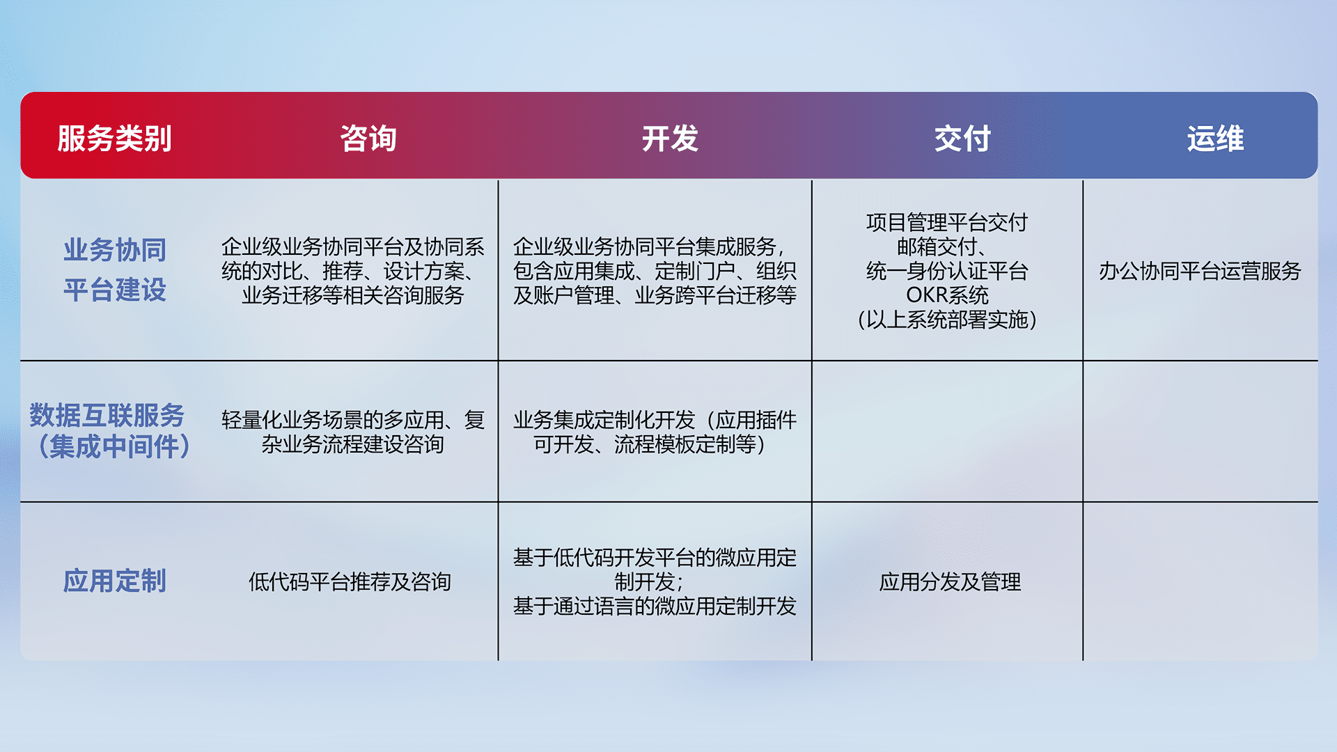 针对钉钉、、、企微、、、、IDaas等平台级产品提供产品的规划、、、方案、、、、交付、、定制化开发等服务,,,,实现如统一协同办公、、、智能客户服务、、、混合会议管理、、、、智能数据查询、、等业务场景,,,实现数字化转型。。。。