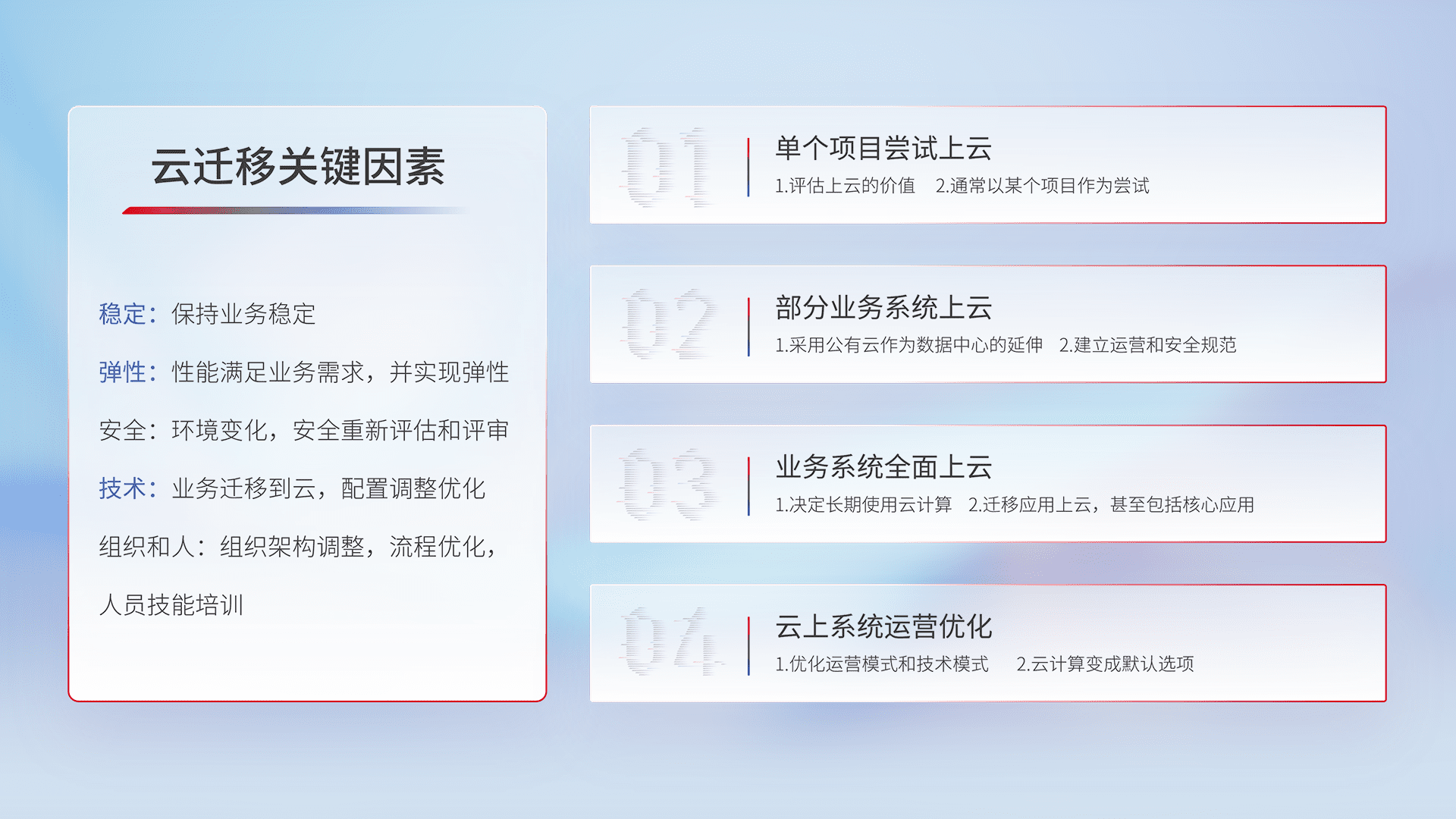 结合实际业务,,从规划设计、、、云平台选型、、、、云原生改造、、数据迁移、、、、集成交付,,,迁移全过程为客户识别最佳上云路径,,,,做好风险识别管理,,,设计网络架构、、、身份权限、、、安全审计合规、、、、操作审计、、日志审计、、监控告警策略、、、多站点容灾设计等,,对云上基础设施进行整体规划,,,提升IT治理水平,,,以满足弹性、、高可用、、、、高性能的需求。。。