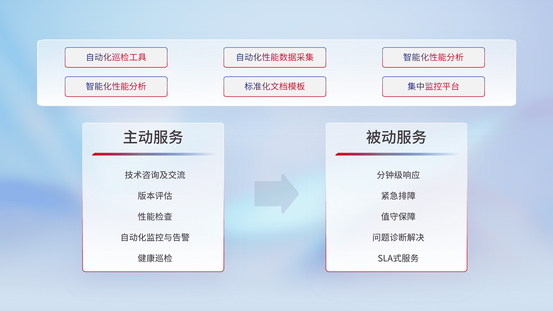 智能化工具和标准化文档,,,保障服务质量,,,提供主动服务(包含技术咨询、、、版本评估、、性能检查、、自动化监控与告警、、、、健康巡检)和被动服务包含(分钟级响应、、、、紧急排障、、、、值守保障、、、问题诊断解决、、SLA服务)。。
